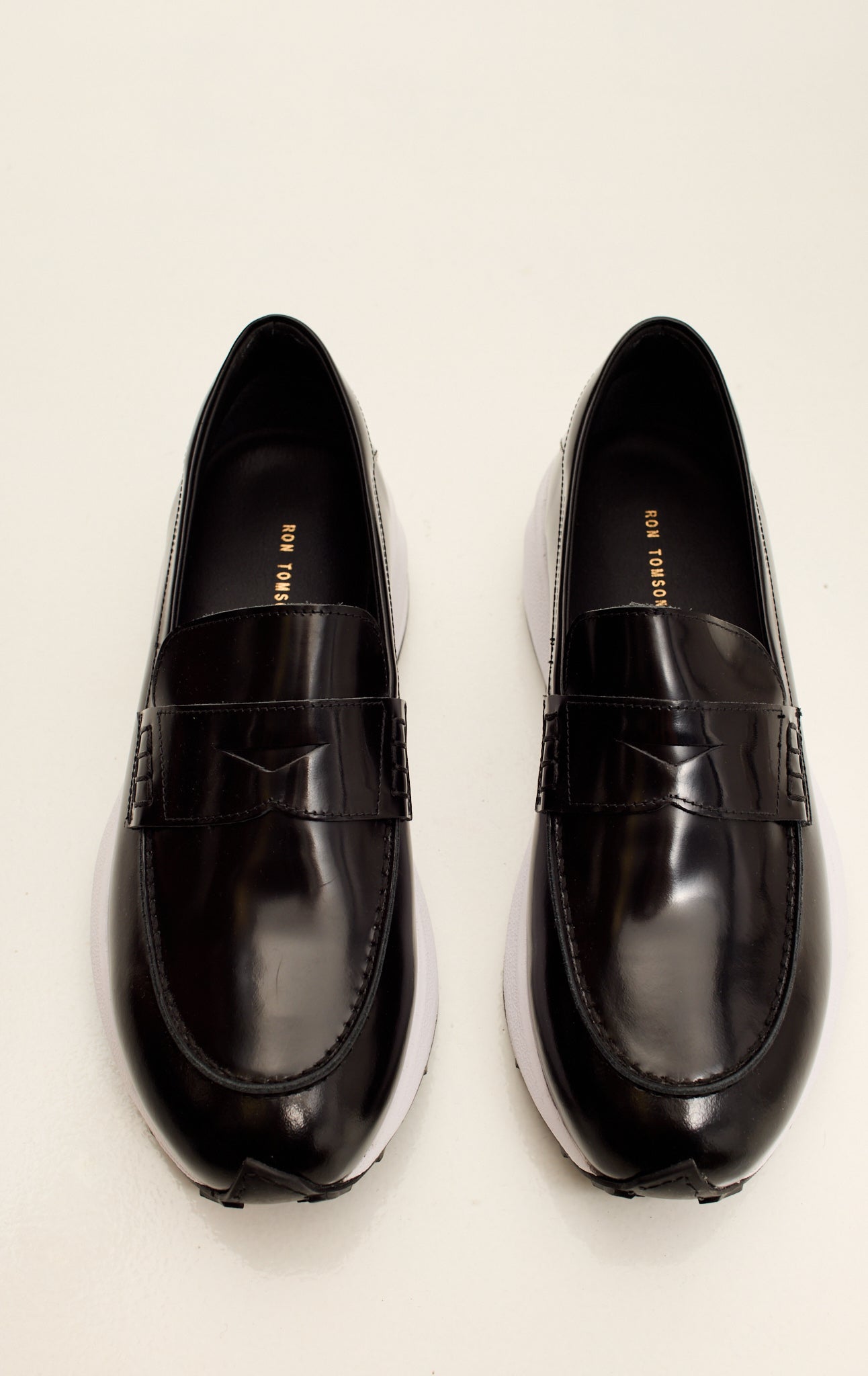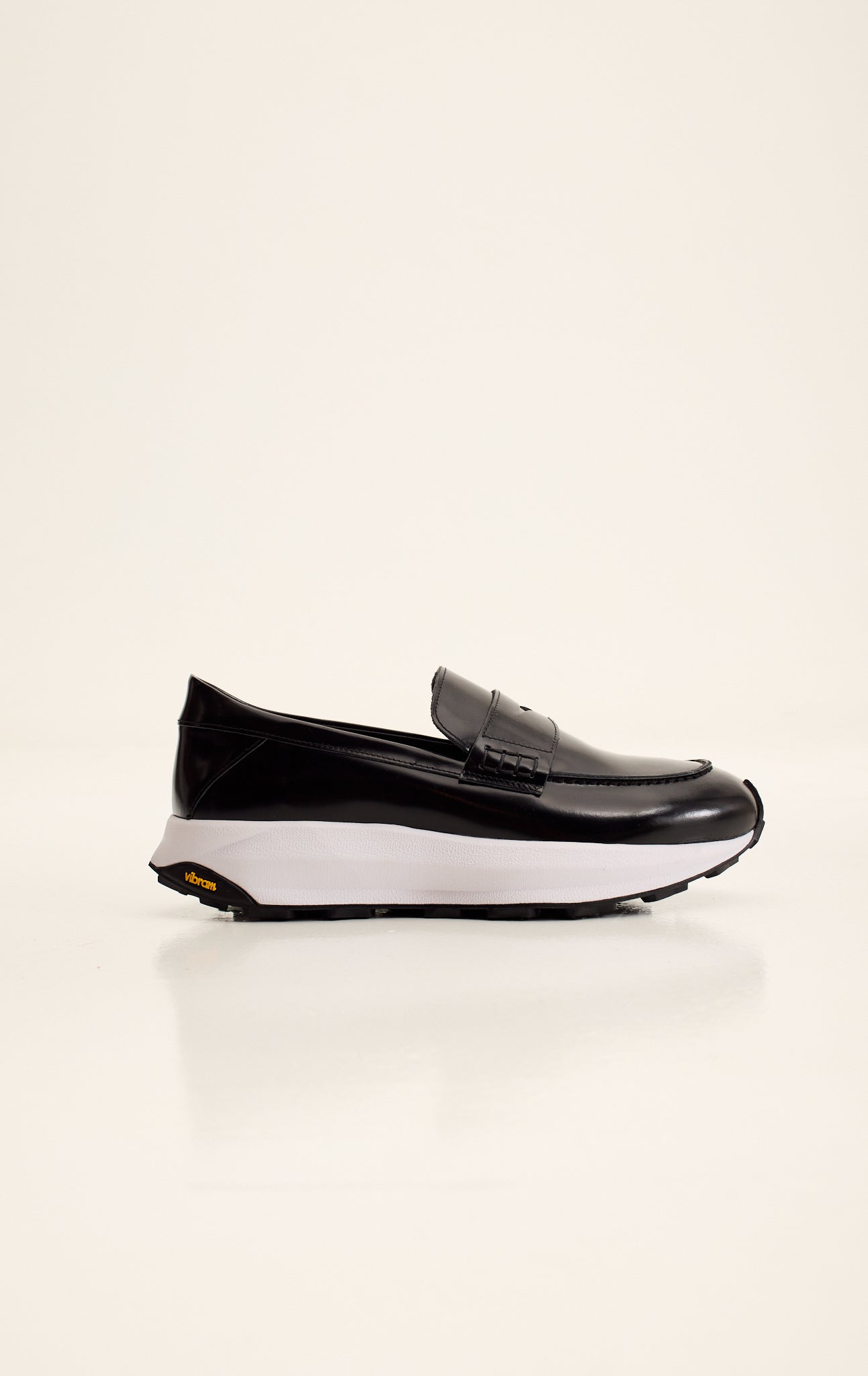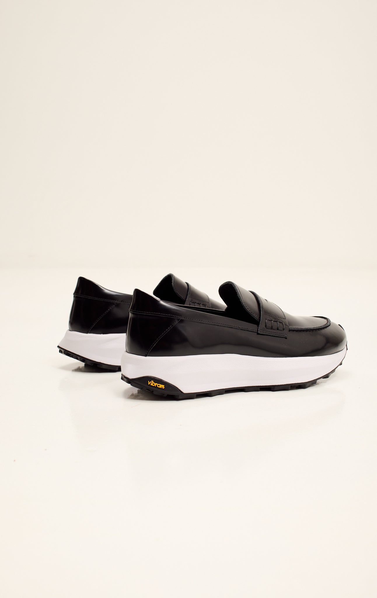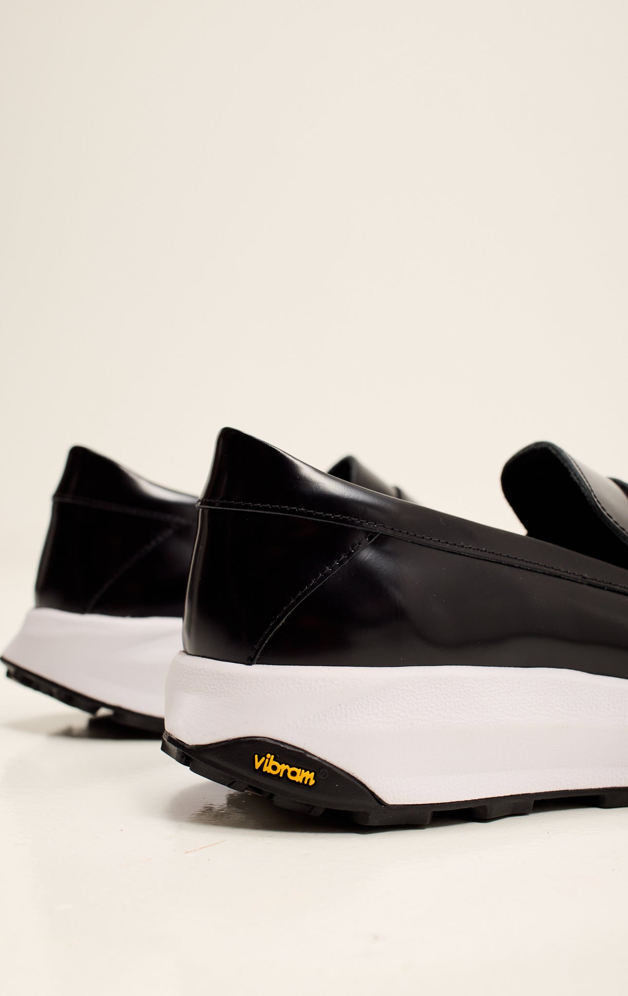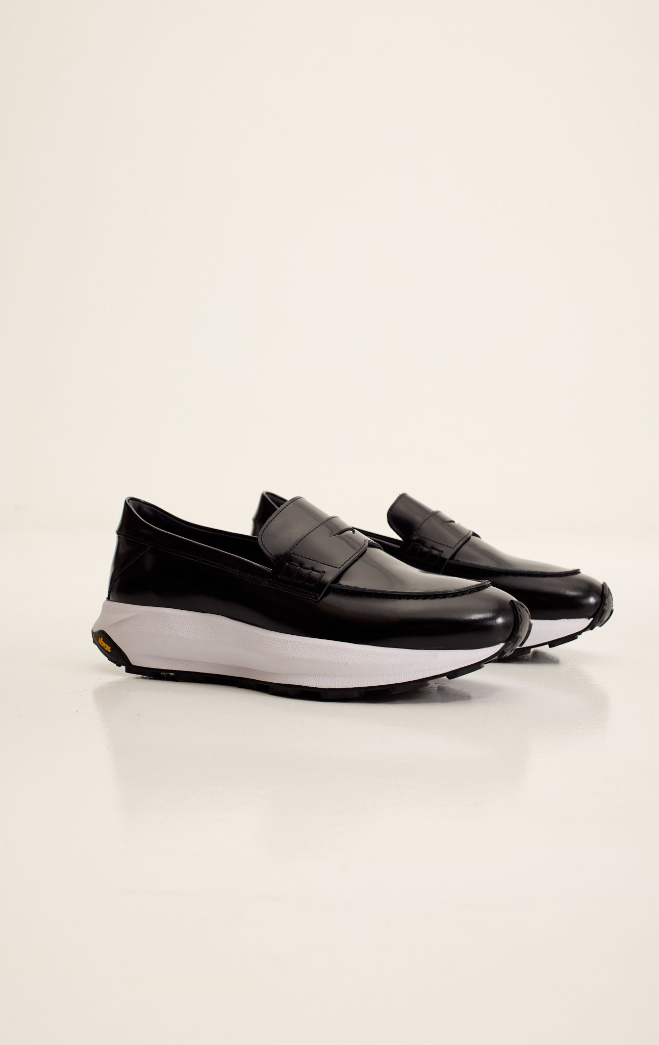 Make a bold statement with these striking black loafers, crafted from polished leather. Featuring Italian Vibram soles for superior traction and durability, these shoes fuse high-shine elegance with modern comfort. The sleek design and cushioned sole make them perfect for elevating any outfit, from casual to formal occasions.