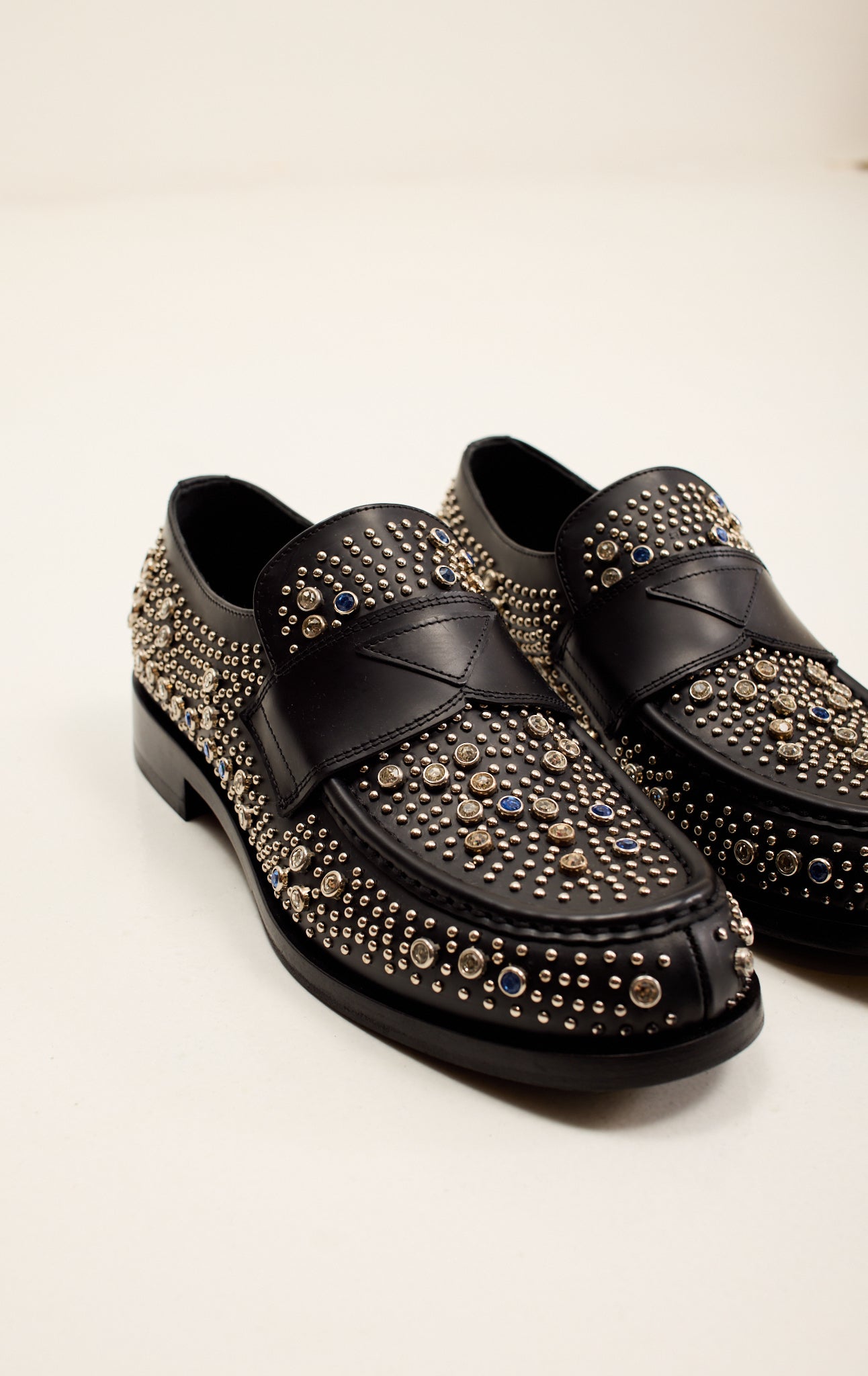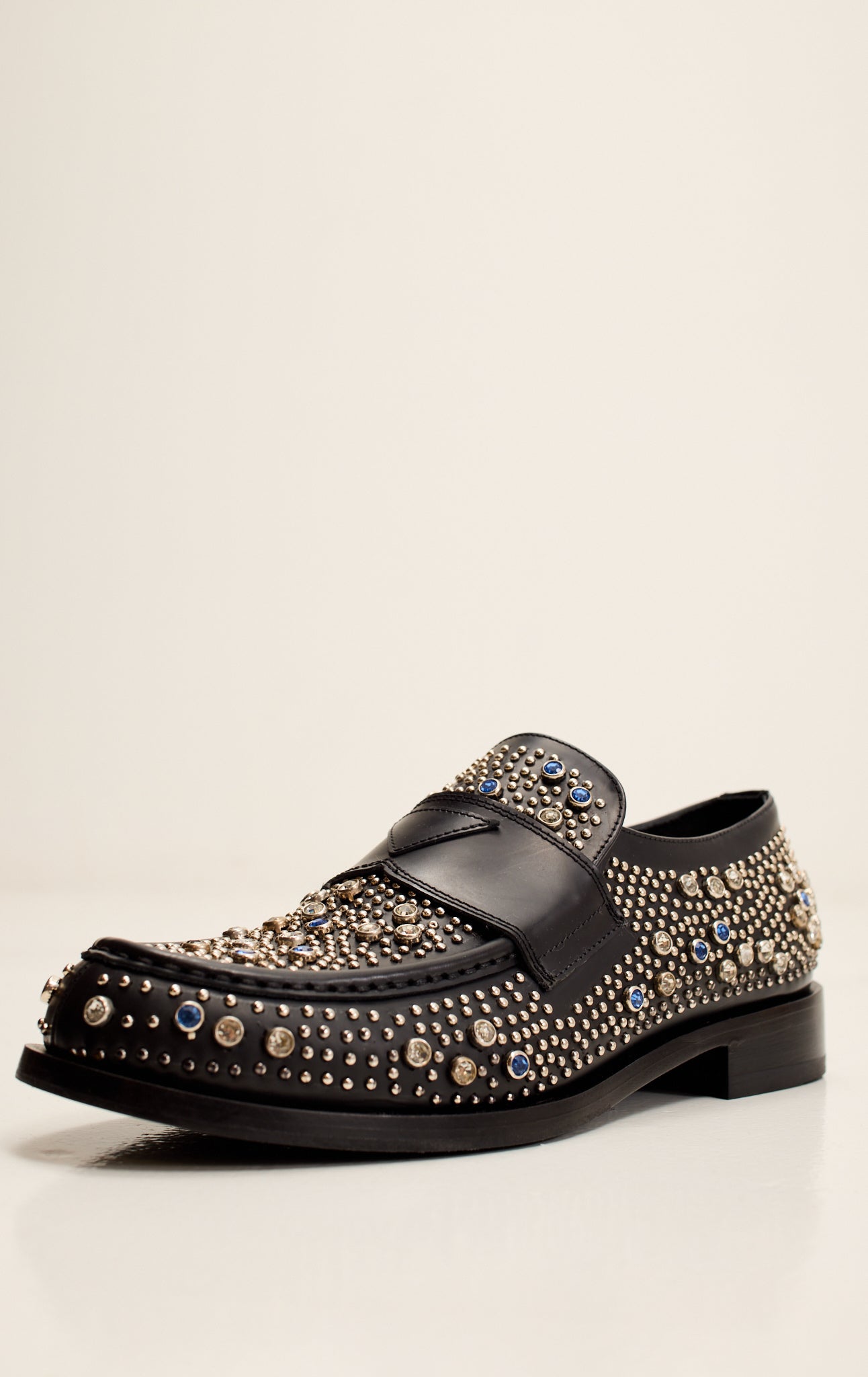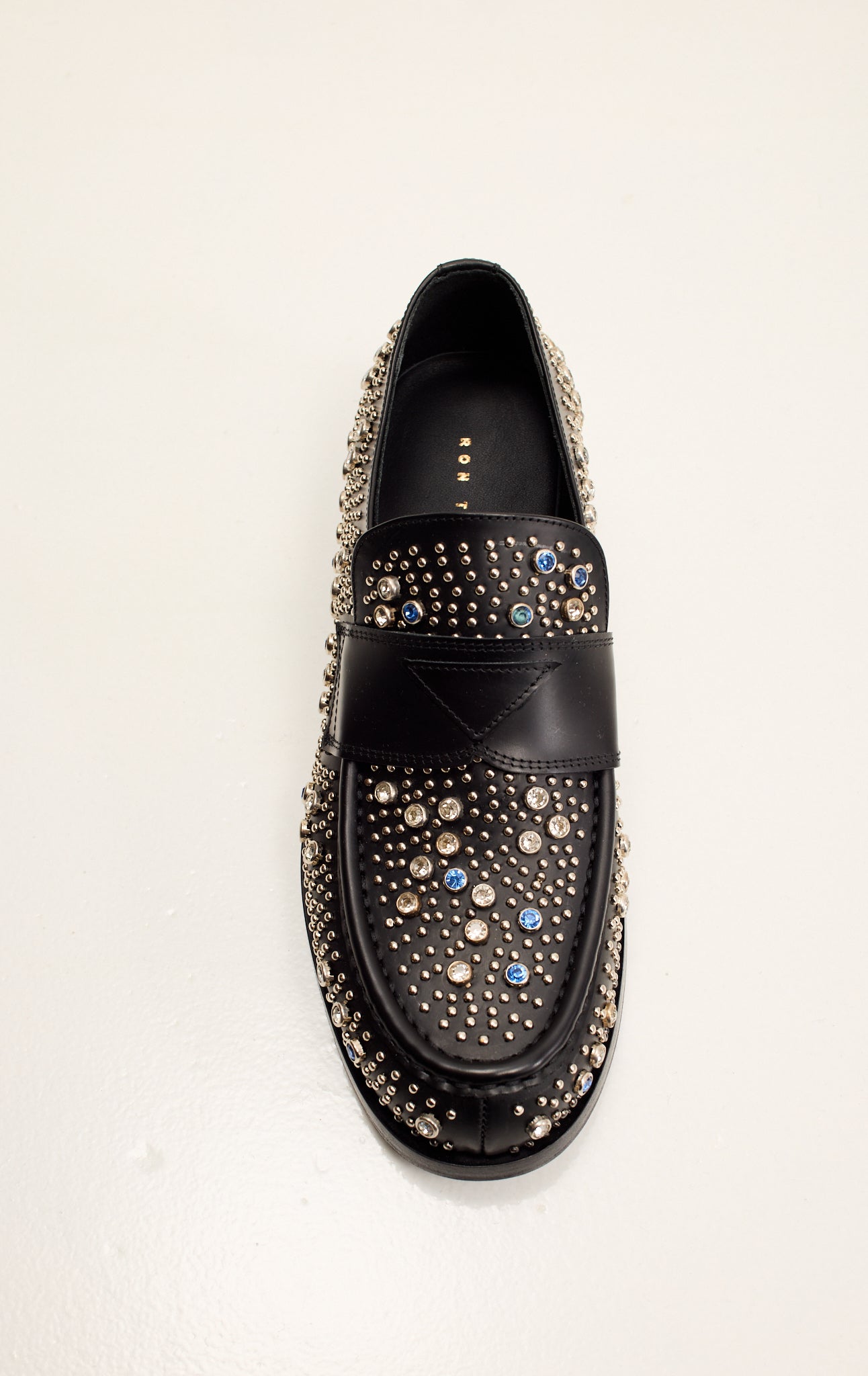 The Ron Tomson Studded Leather Loafer showcases premium black leather adorned with intricate stud and gem embellishments, offering a perfect blend of bold elegance and contemporary craftsmanship. This slip-on shoe, ensures a comfortable fit with its cushioned insole and durable construction.