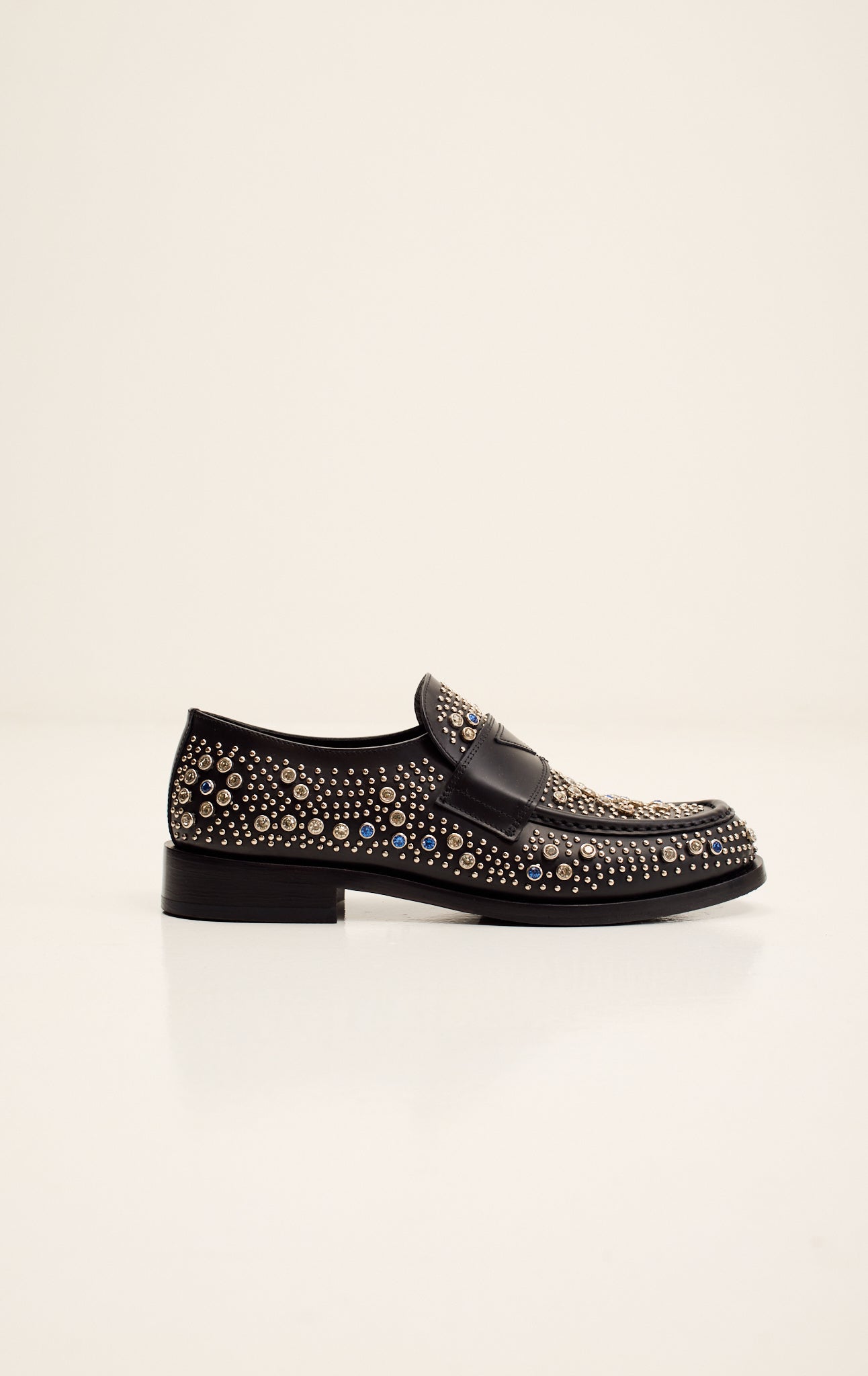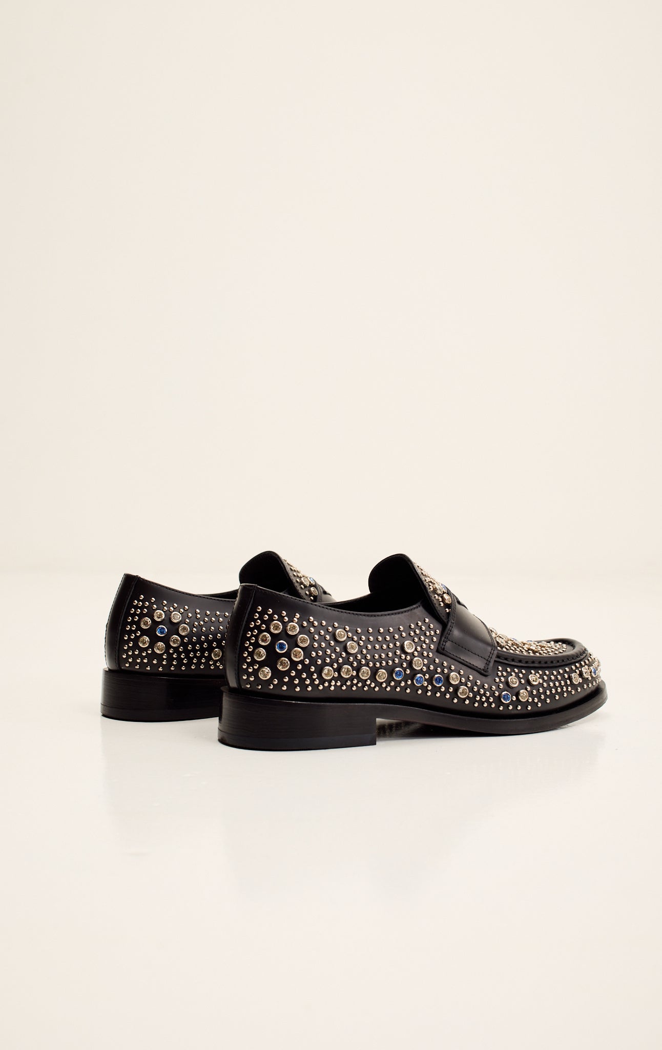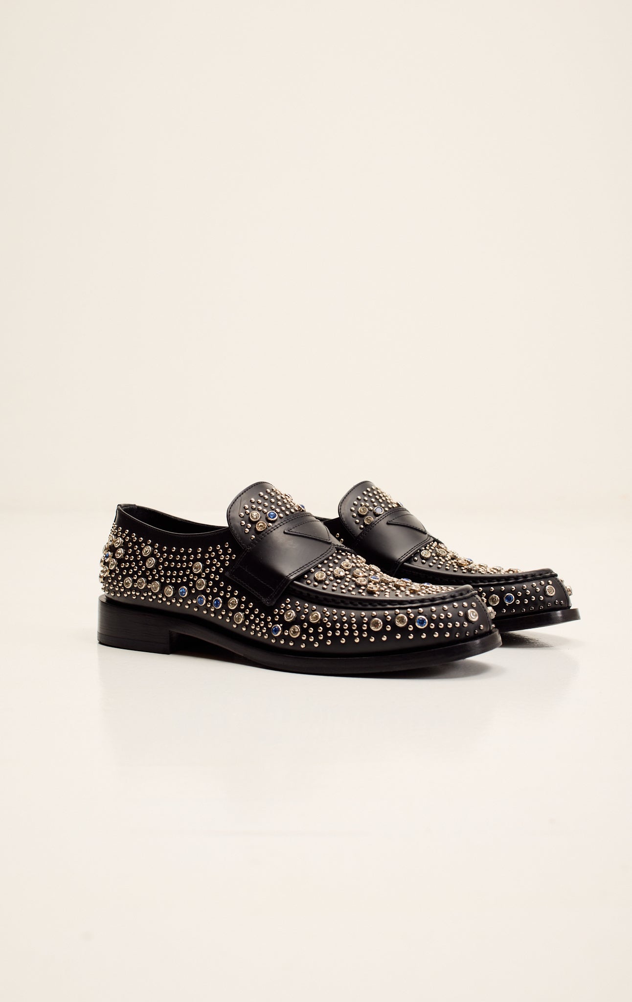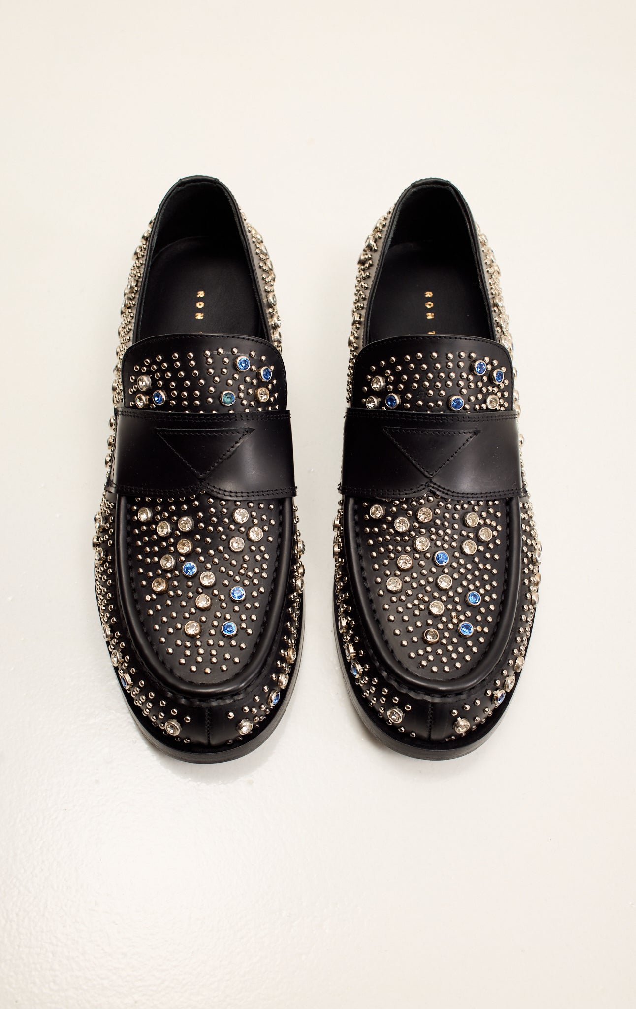 The Ron Tomson Studded Leather Loafer showcases premium black leather adorned with intricate stud and gem embellishments, offering a perfect blend of bold elegance and contemporary craftsmanship. This slip-on shoe, ensures a comfortable fit with its cushioned insole and durable construction.