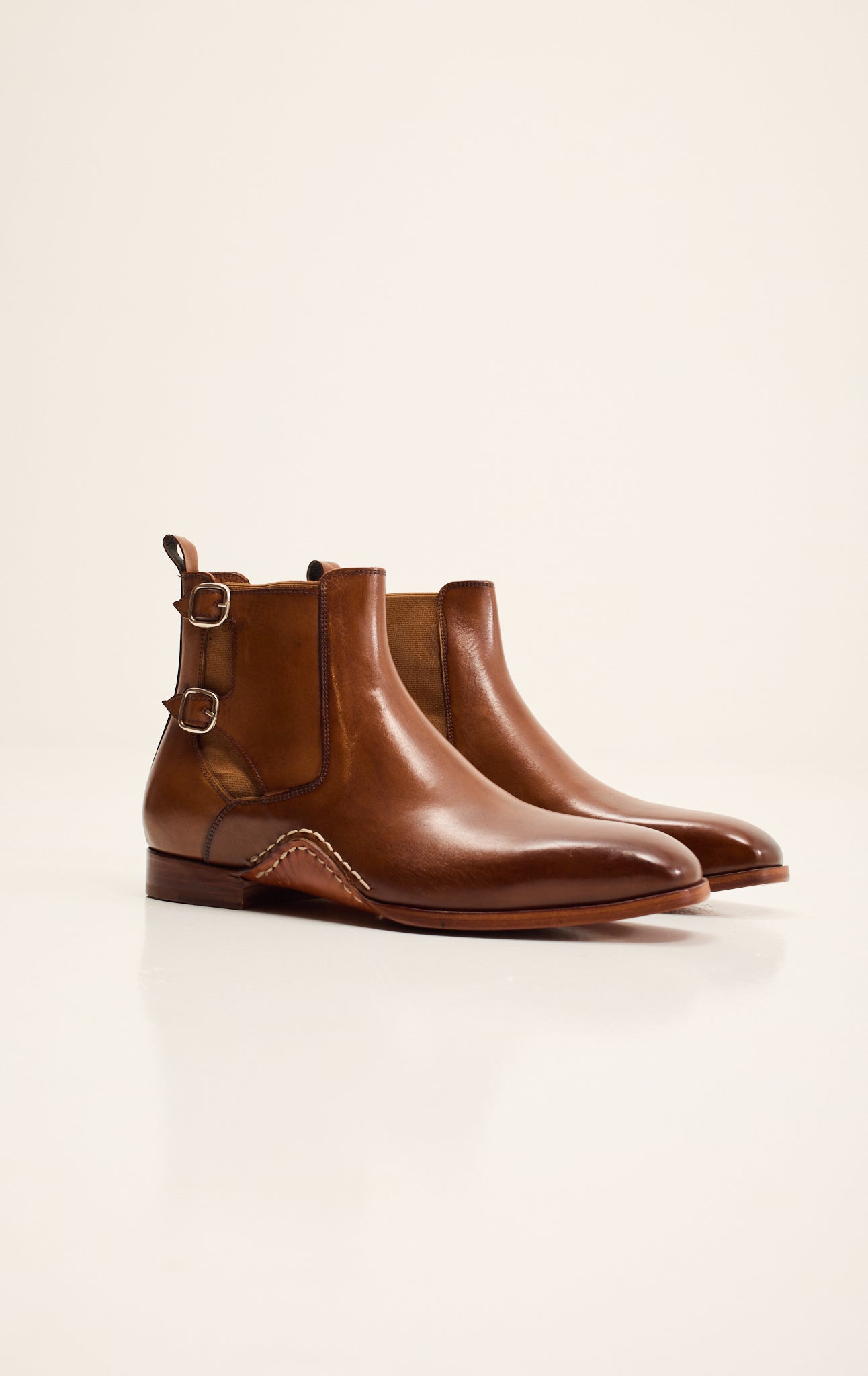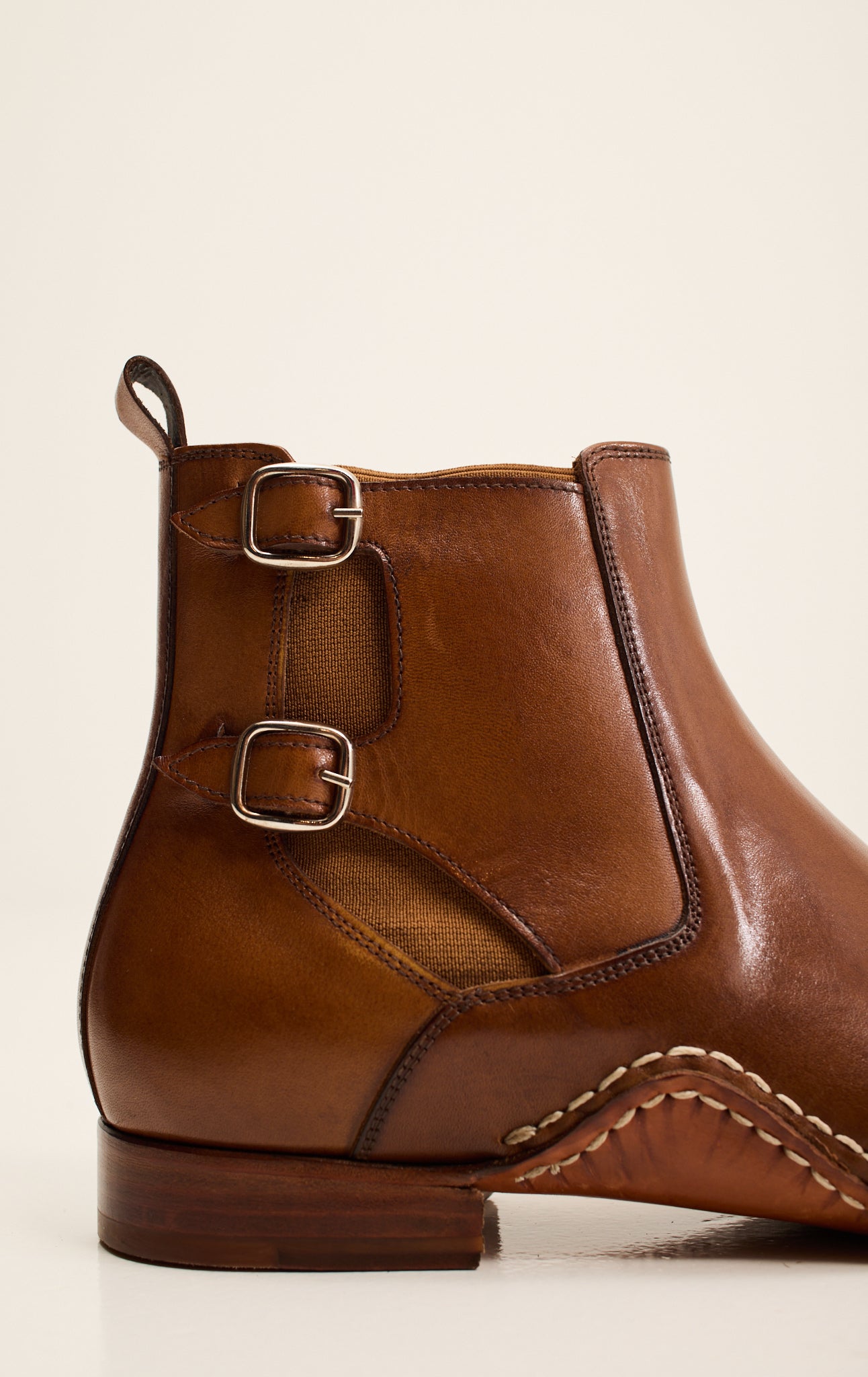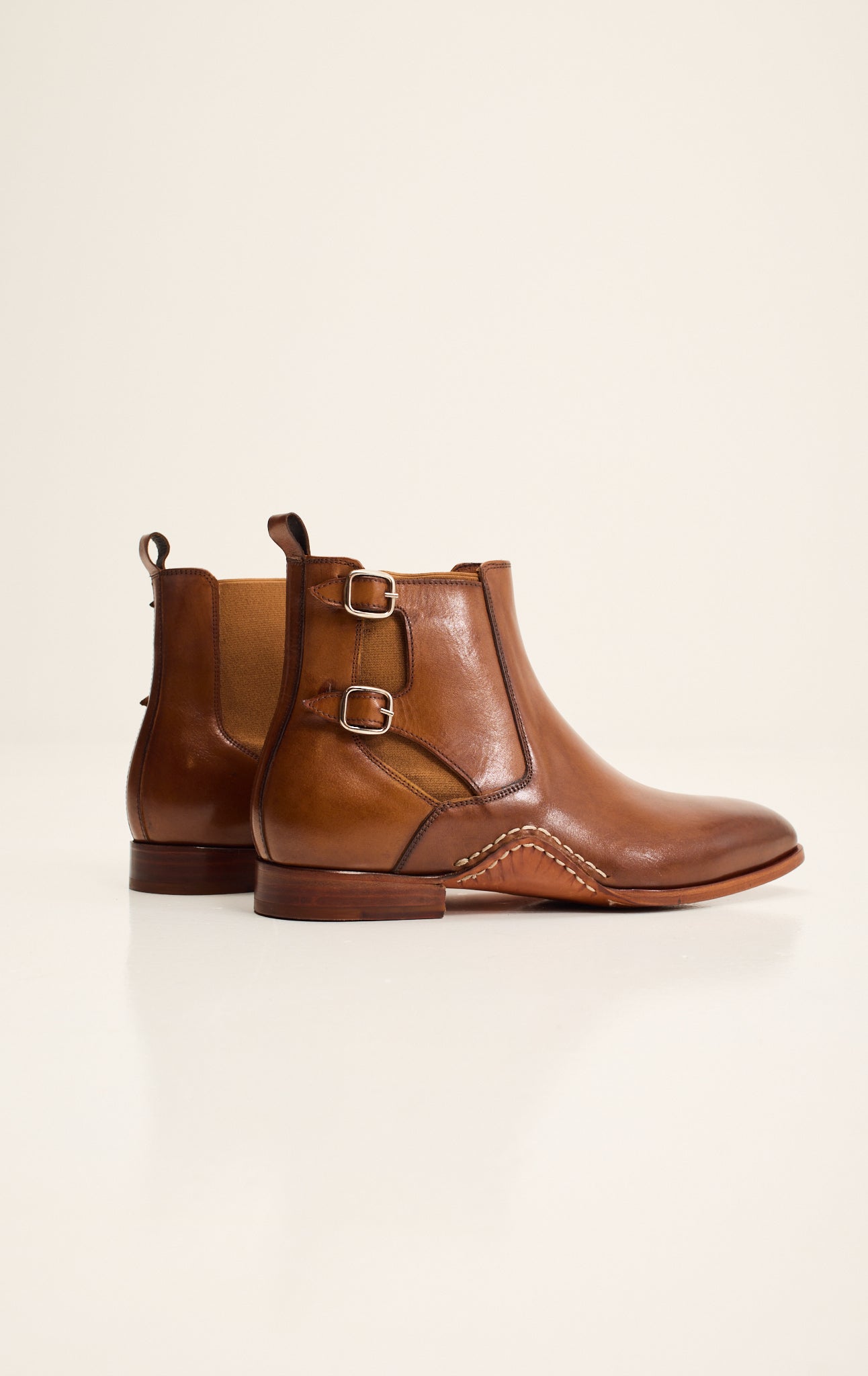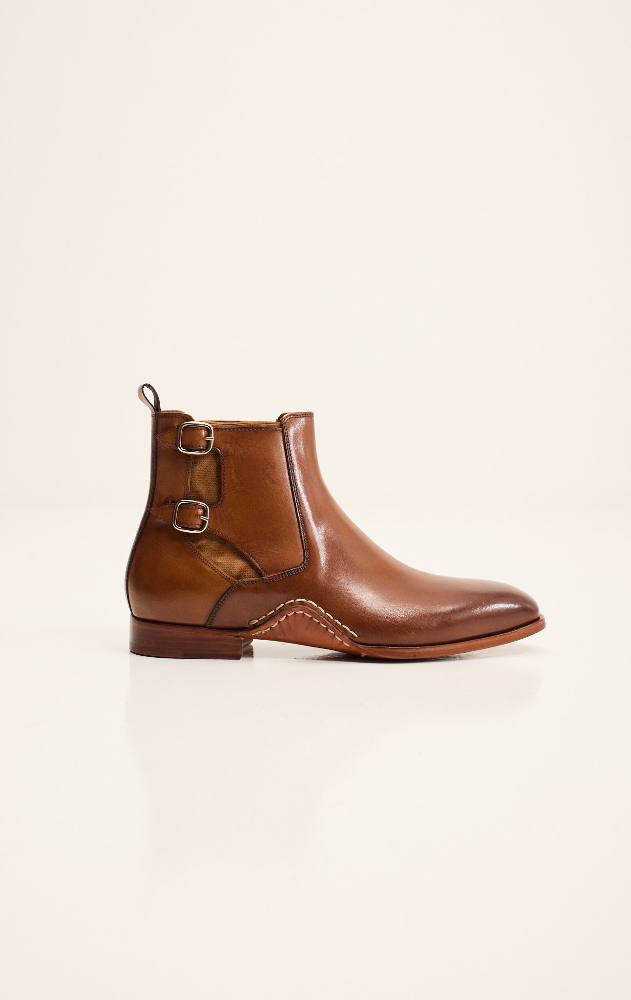 Sleek sophistication meets artisanal craftsmanship in the Ron Tomson Double-Buckle Italian Leather Chelsea Boot. Handcrafted from premium full-grain leather in a rich cognac tone, this boot features refined double side buckles for a contemporary twist on a classic silhouette. A supple Italian leather insole ensures exceptional comfort and breathability, while the hand-stitched welt and leather sole deliver durability and timeless elegance. Designed for the discerning gentleman, this Chelsea boot offers a flawless balance of modern style and heritage shoemaking.