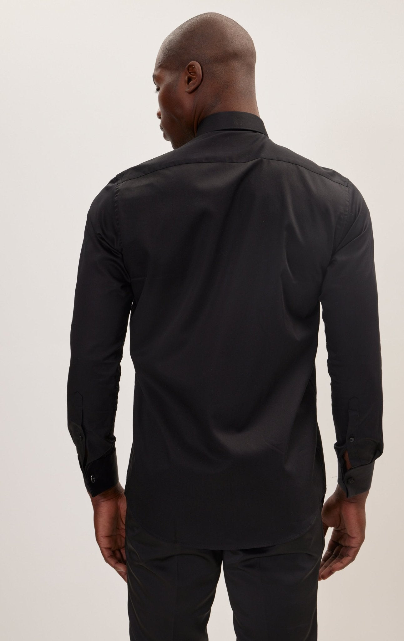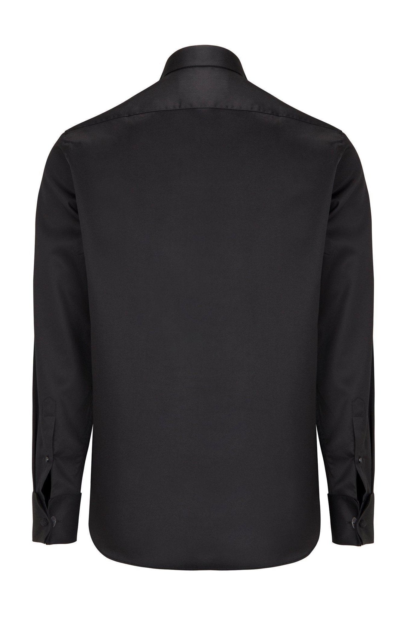 С длинным рукавом расстегнутый воротник застегивается на официальную рубашку. M ADE с европейской чистыми хлопчатобумажной тканью, грудь люрекса филенчатый, черная эмаль в кнопках оклада, и французские манжеты с узловатыми шелковыми запонками.