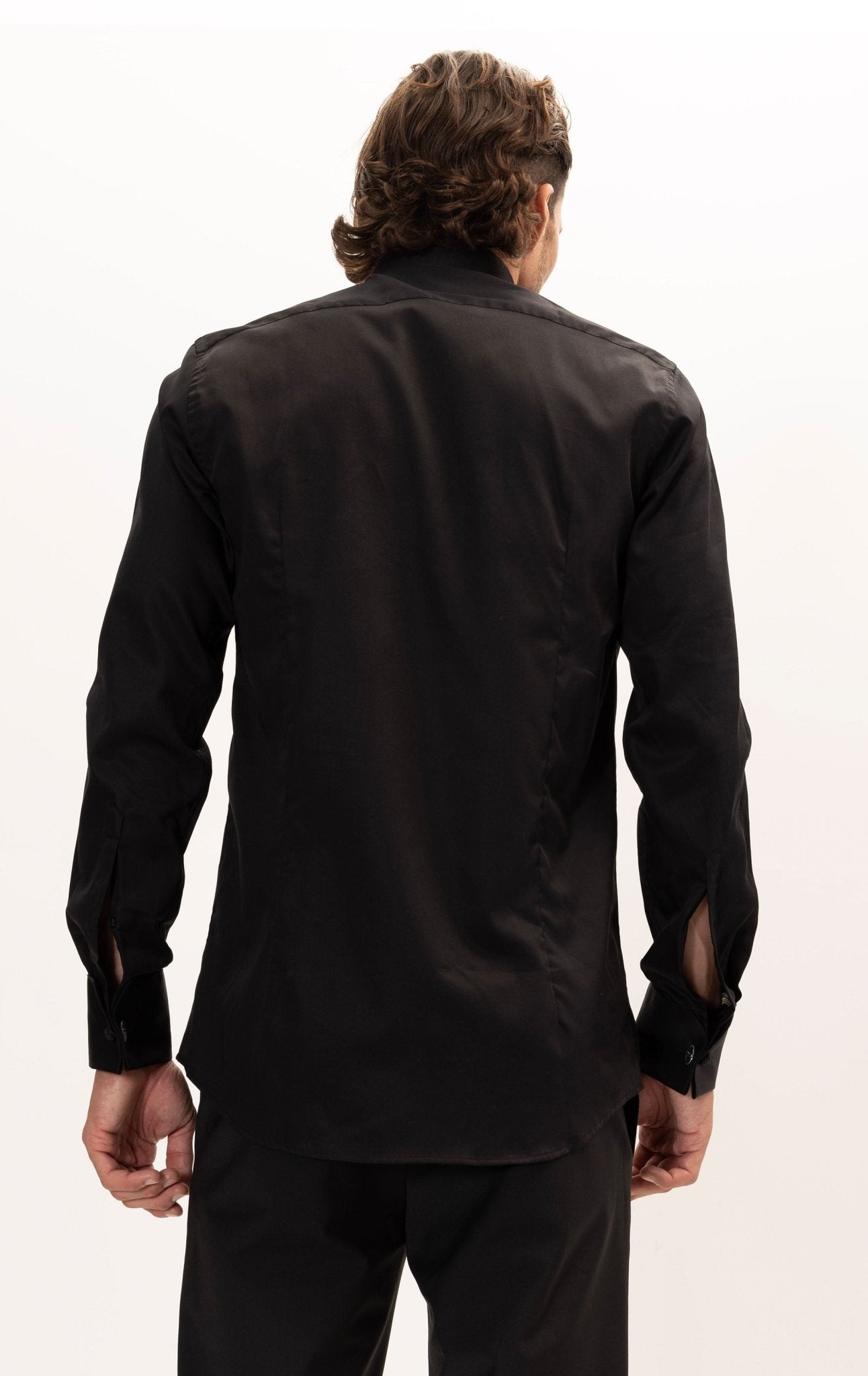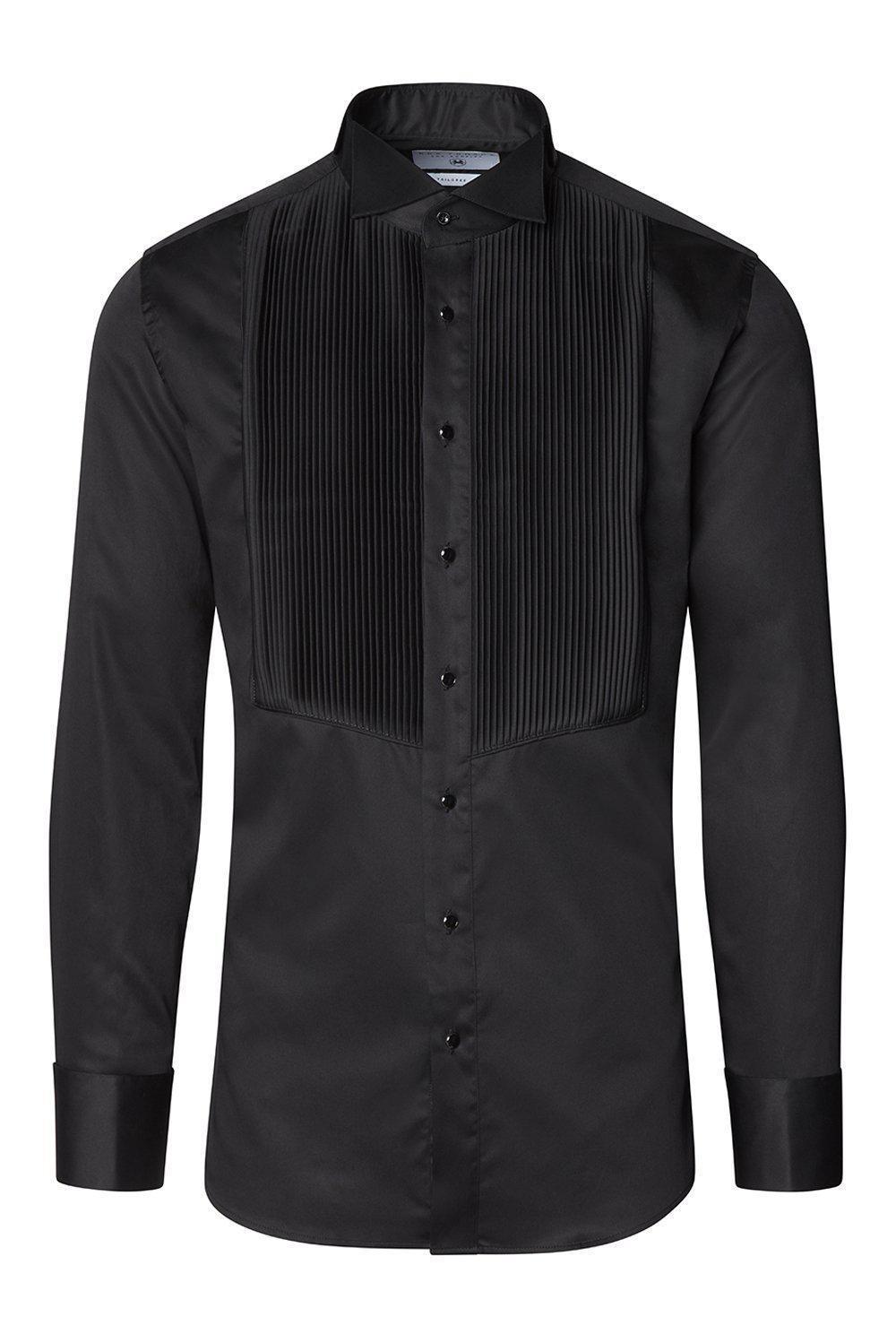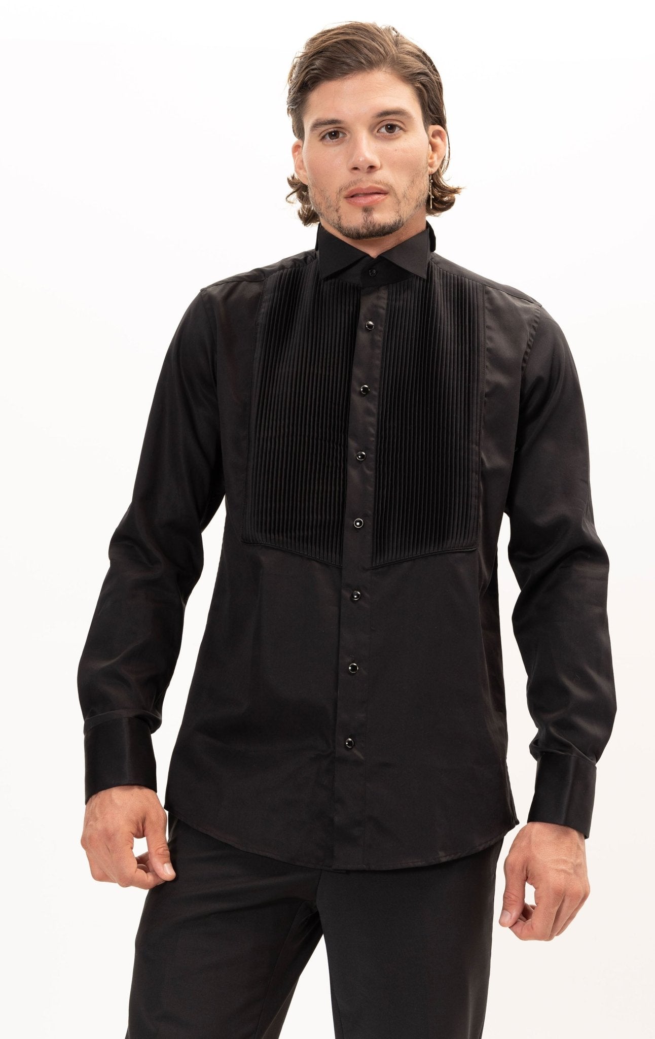 Рубашка с длинным рукавом и воротником на пуговицах. M ADE с европейской чистой хлопчатобумажной тканью, грудью переднего гофрированием, тональными трубопроводами, черной эмалью в кнопках оклада, французских манжеты с узловатыми шелковыми запонками.