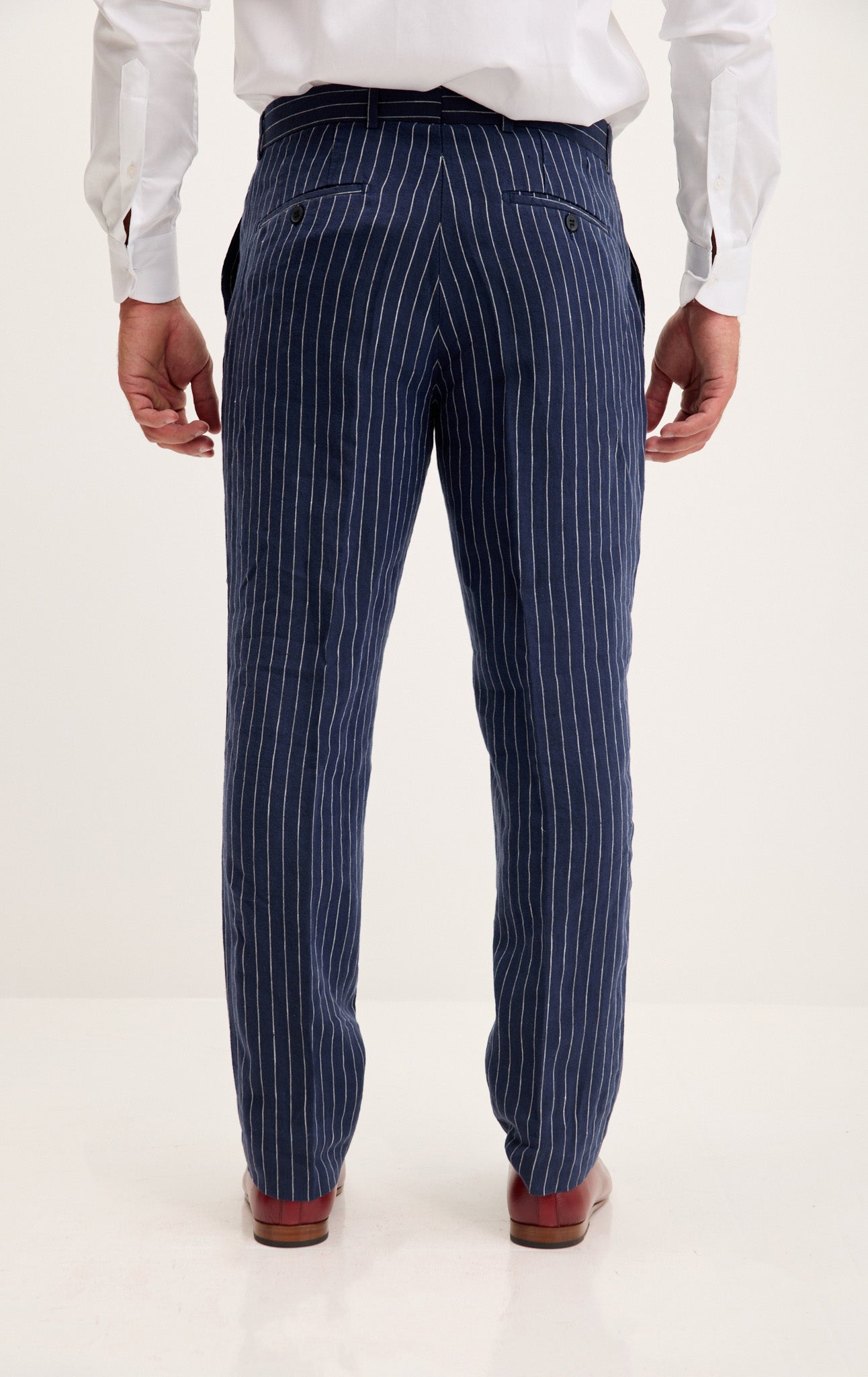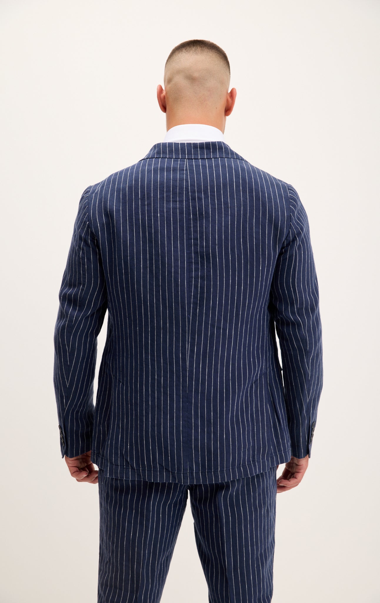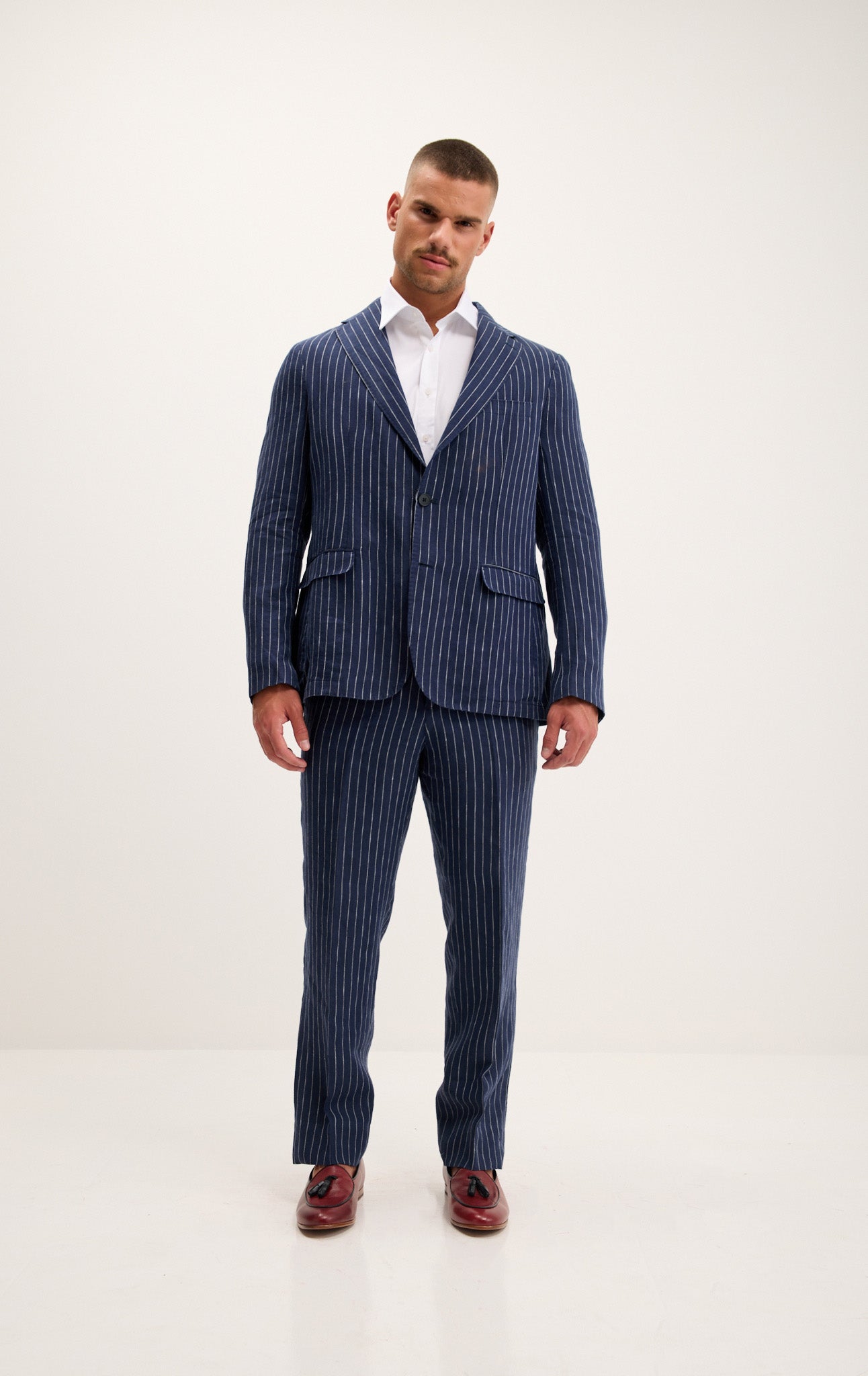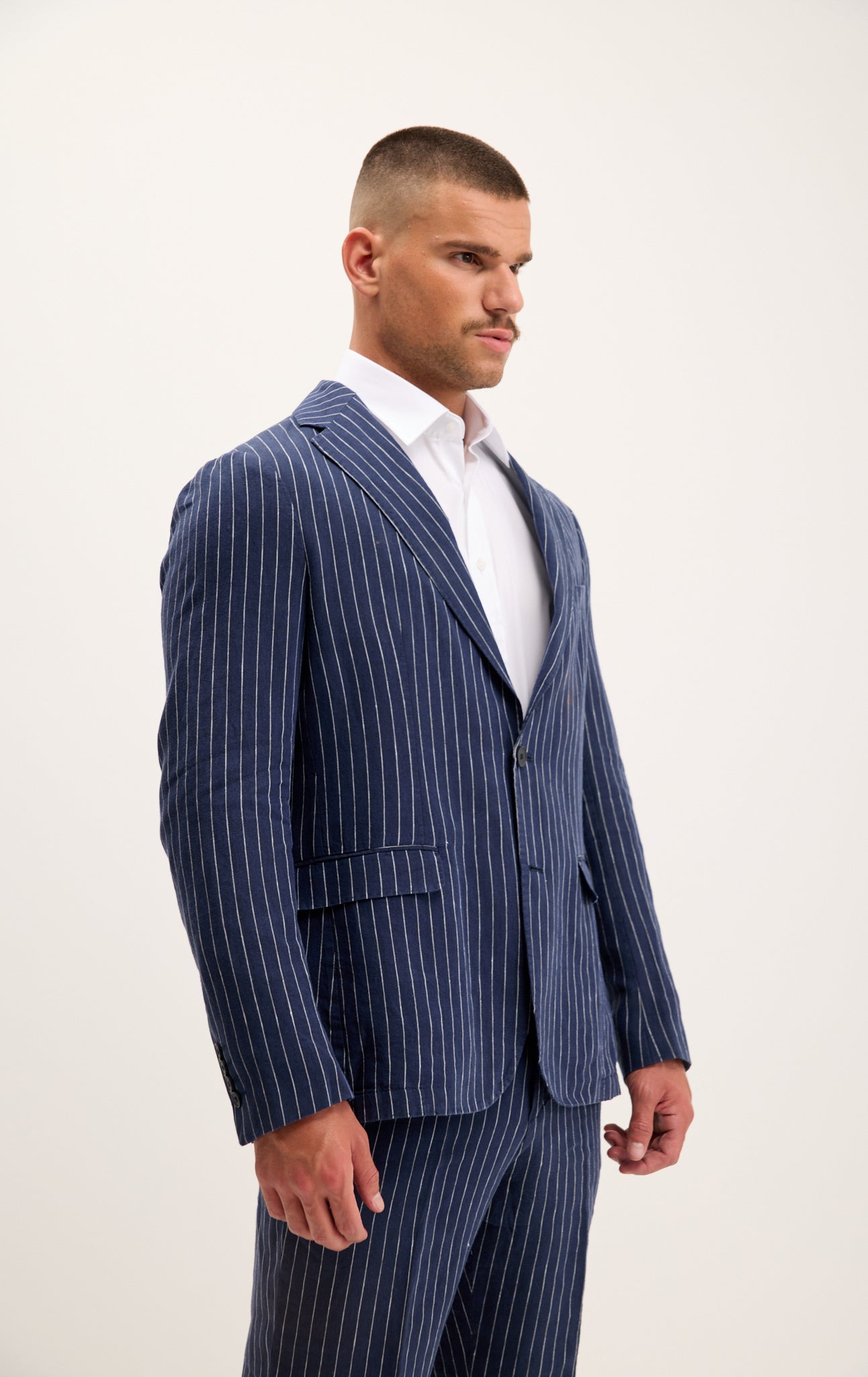 Pinstripe Pure Linen Single Breasted Suit - Dark Navy