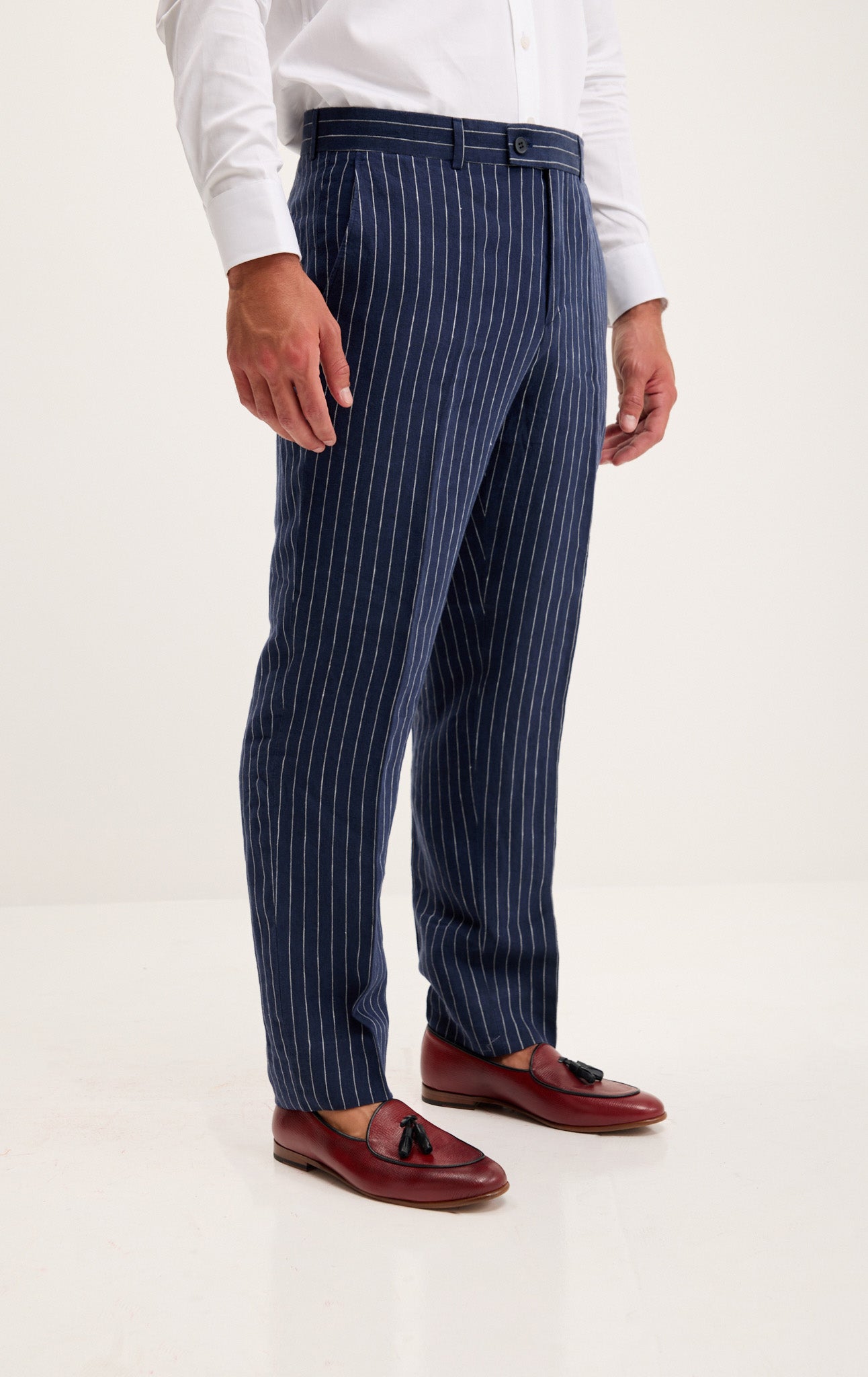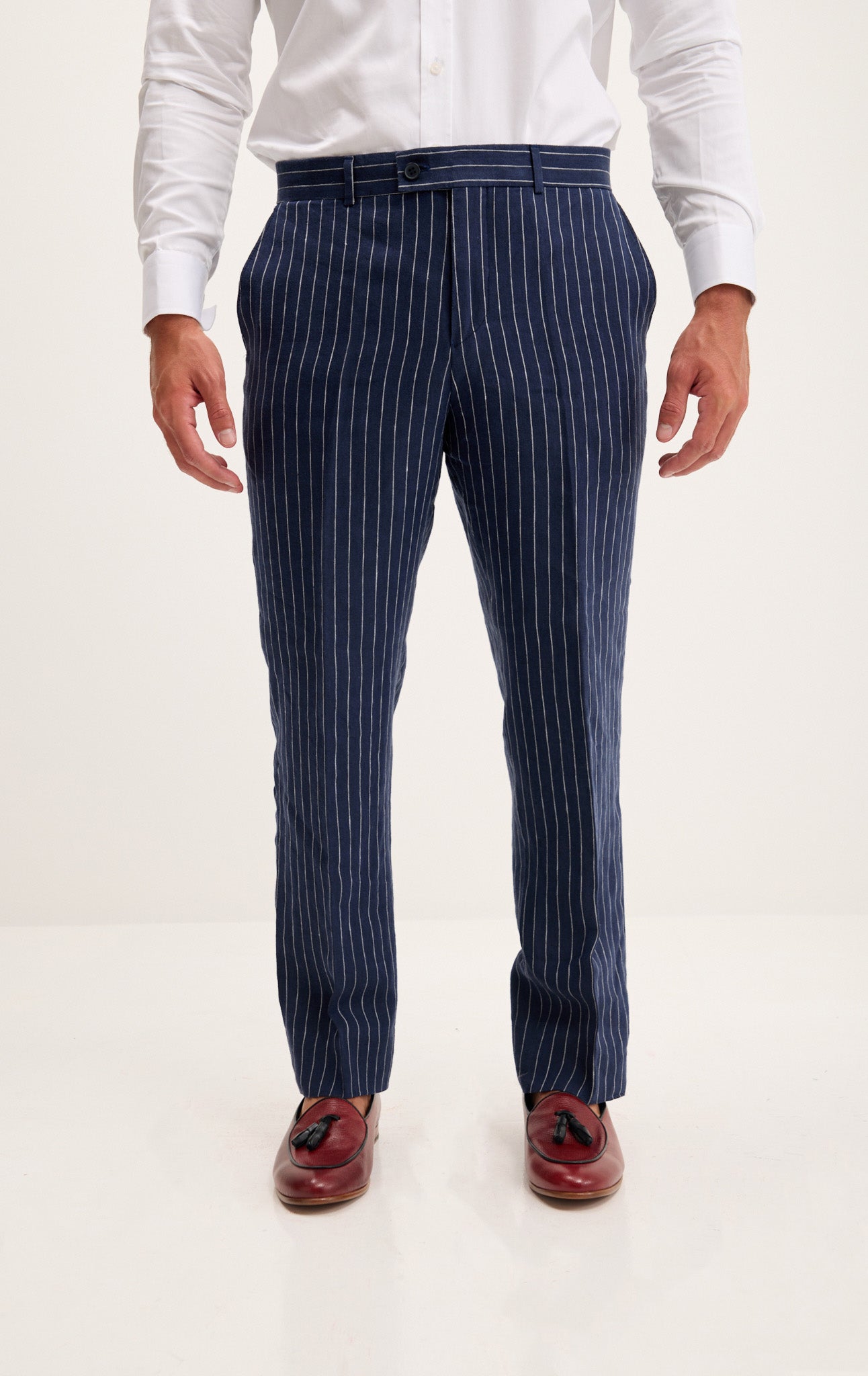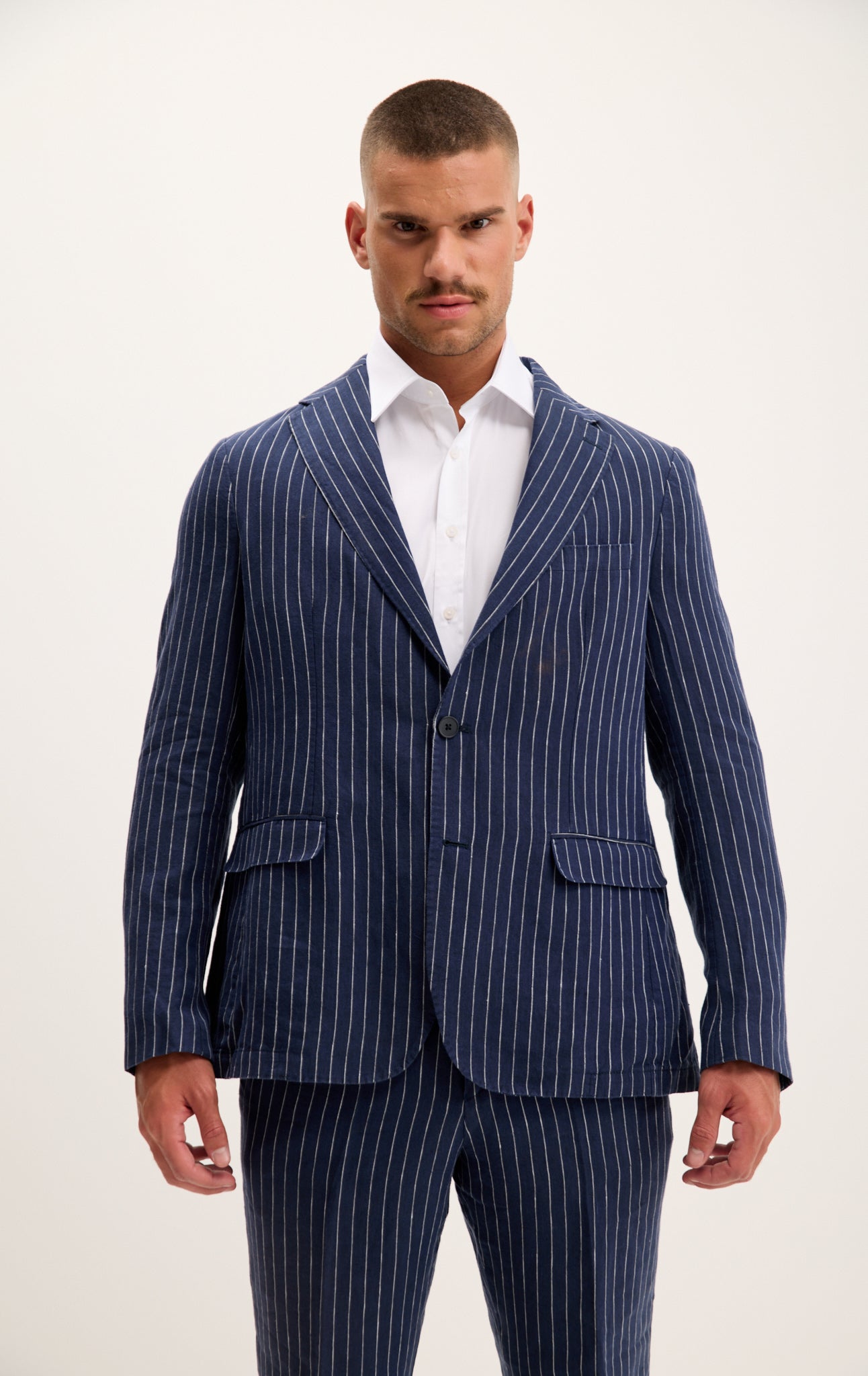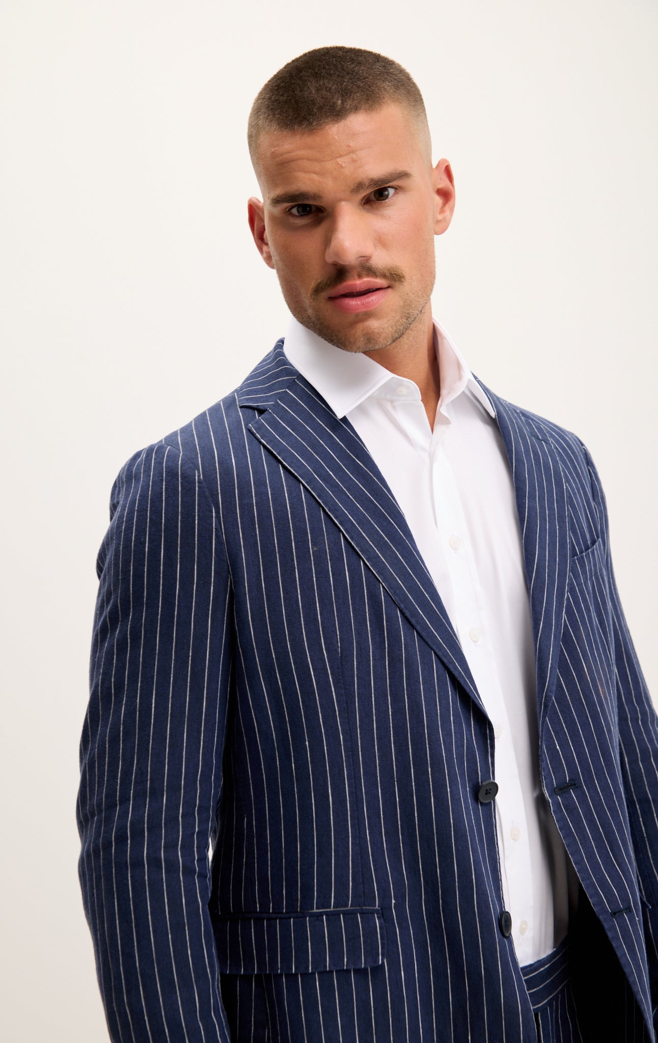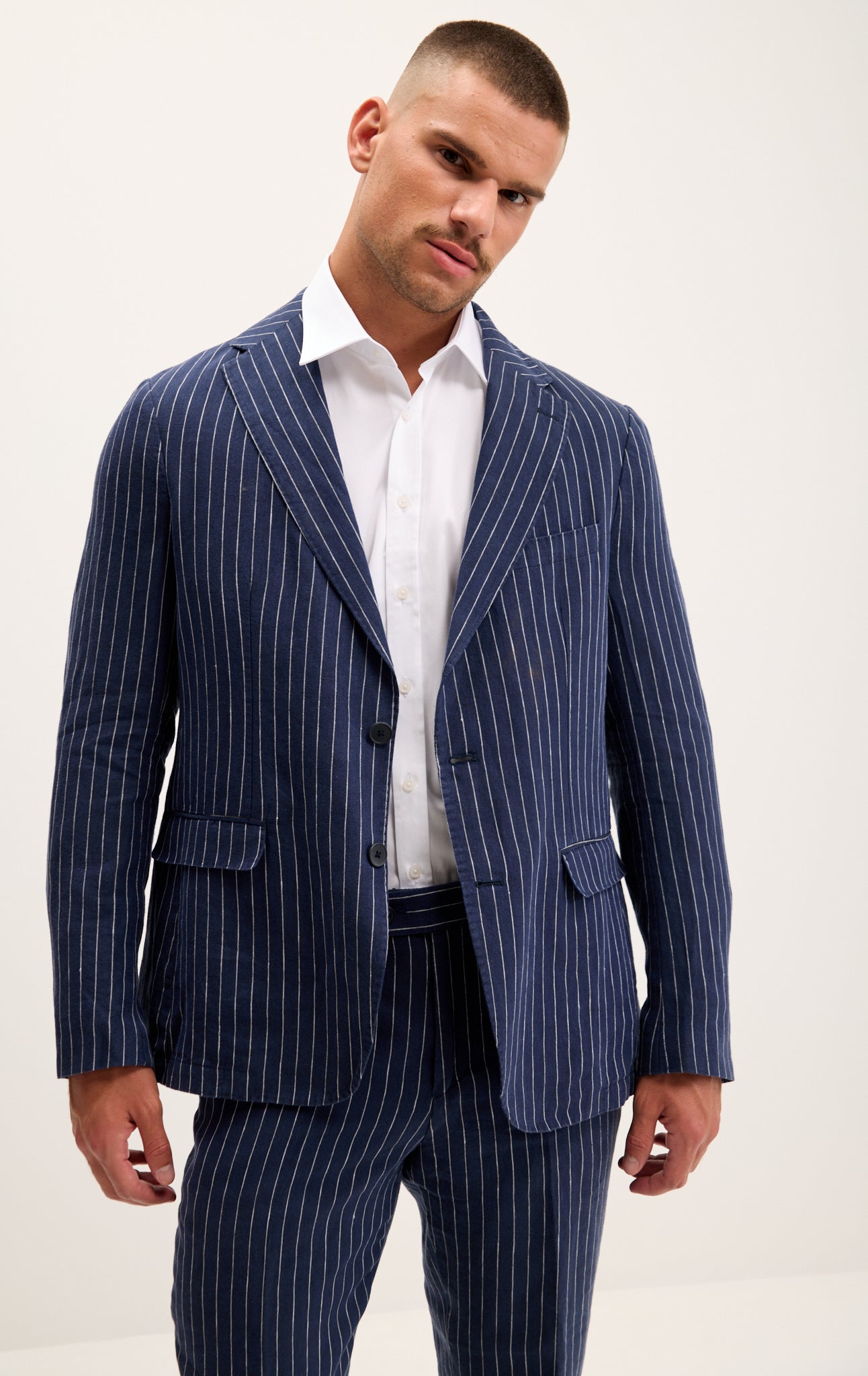 Pinstripe Pure Linen Single Breasted Suit - Dark Navy