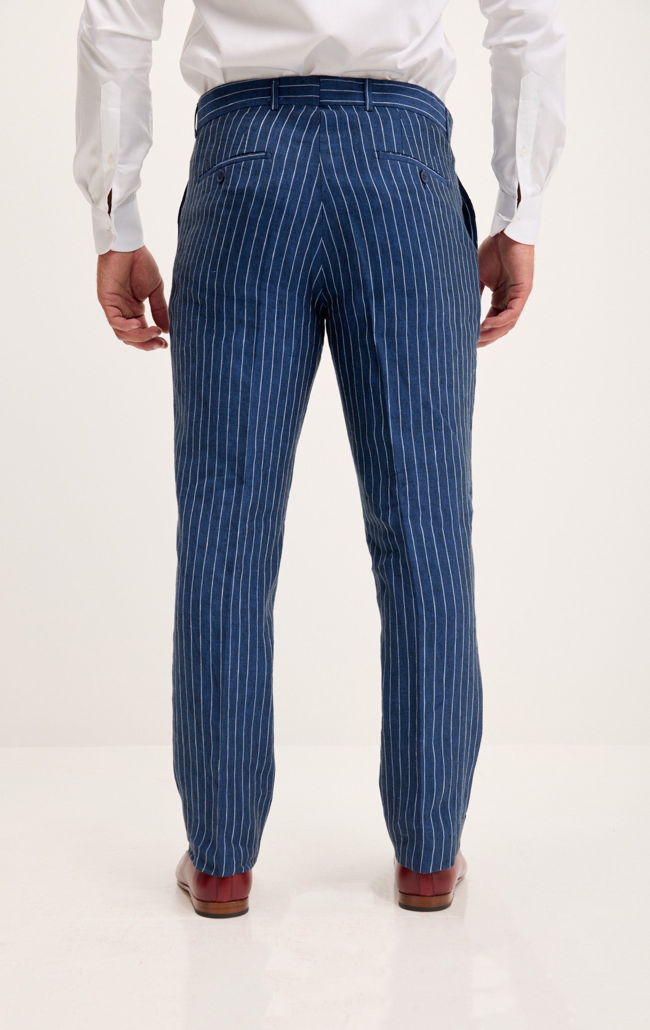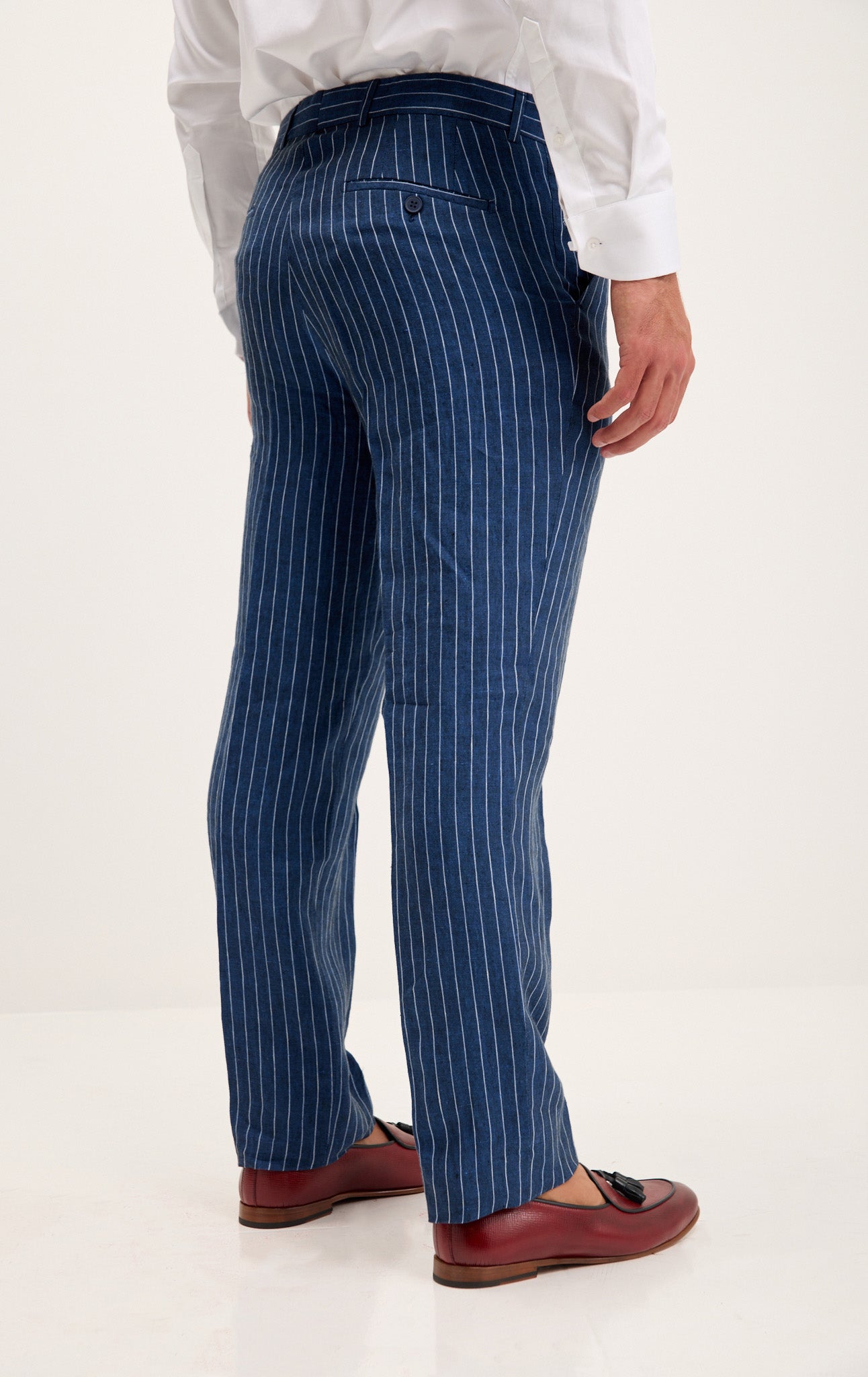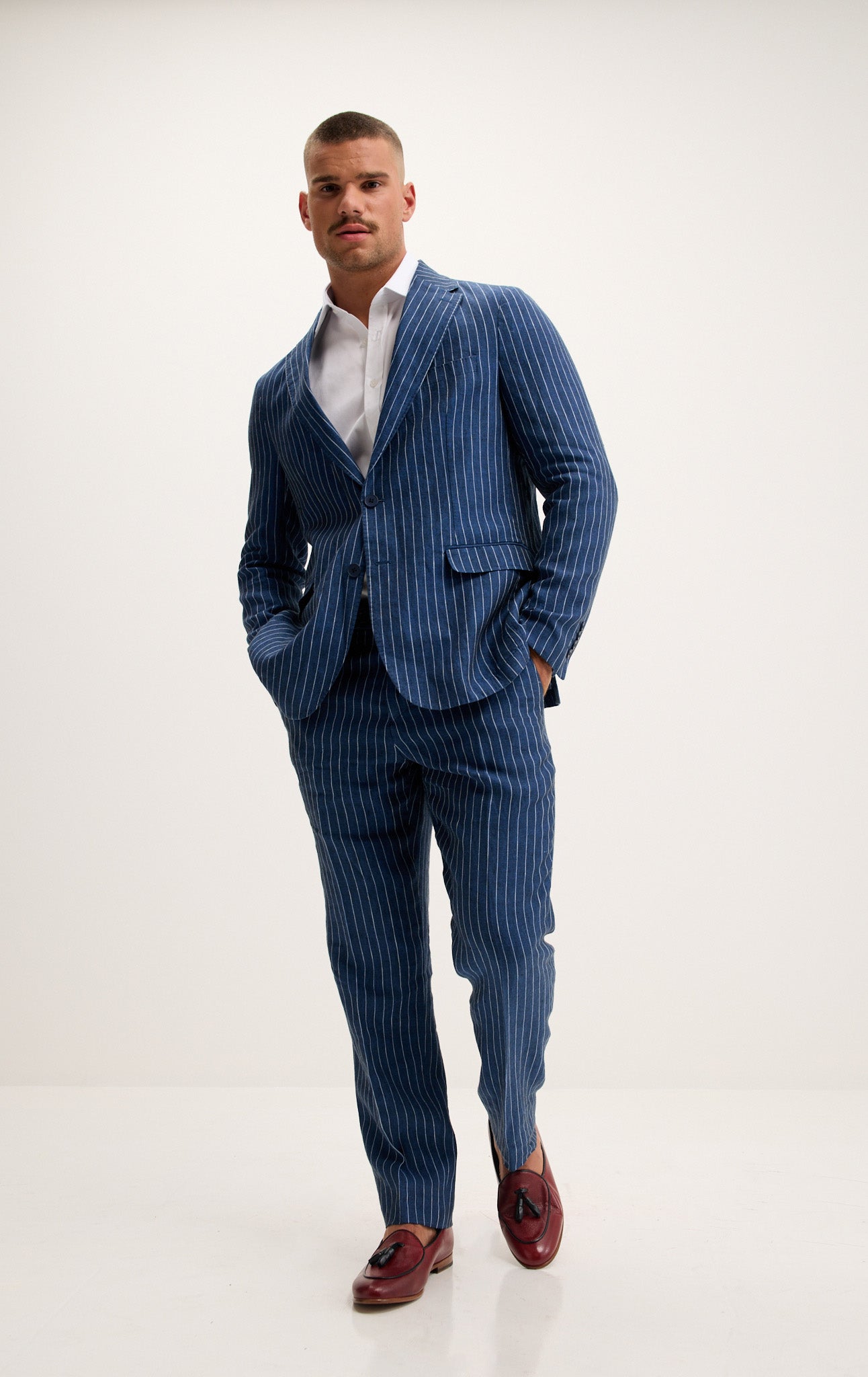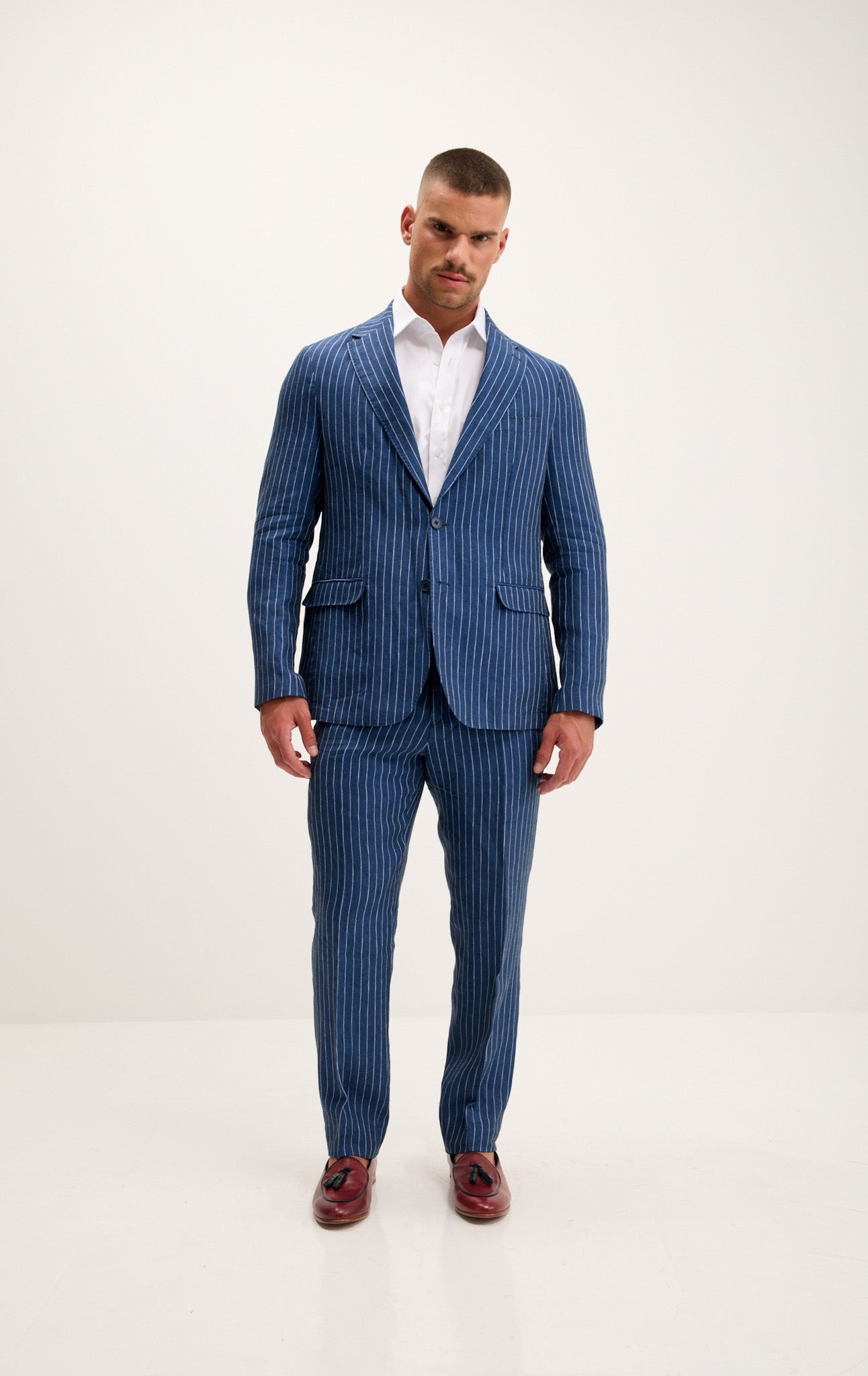Elevate your wardrobe with the Ron Tomson Pinstripe Pure Linen Single Breasted Suit, crafted from premium 100% linen for a lightweight, breathable fit. Featuring a classic pinstripe design in a sophisticated navy hue, this single-breasted suit offers a tailored silhouette with a notched lapel and single-button closure. Perfect for both formal occasions and stylish everyday wear, it includes matching trousers with a clean, modern cut. Ideal for warm weather, this suit combines timeless elegance with natural comfort.