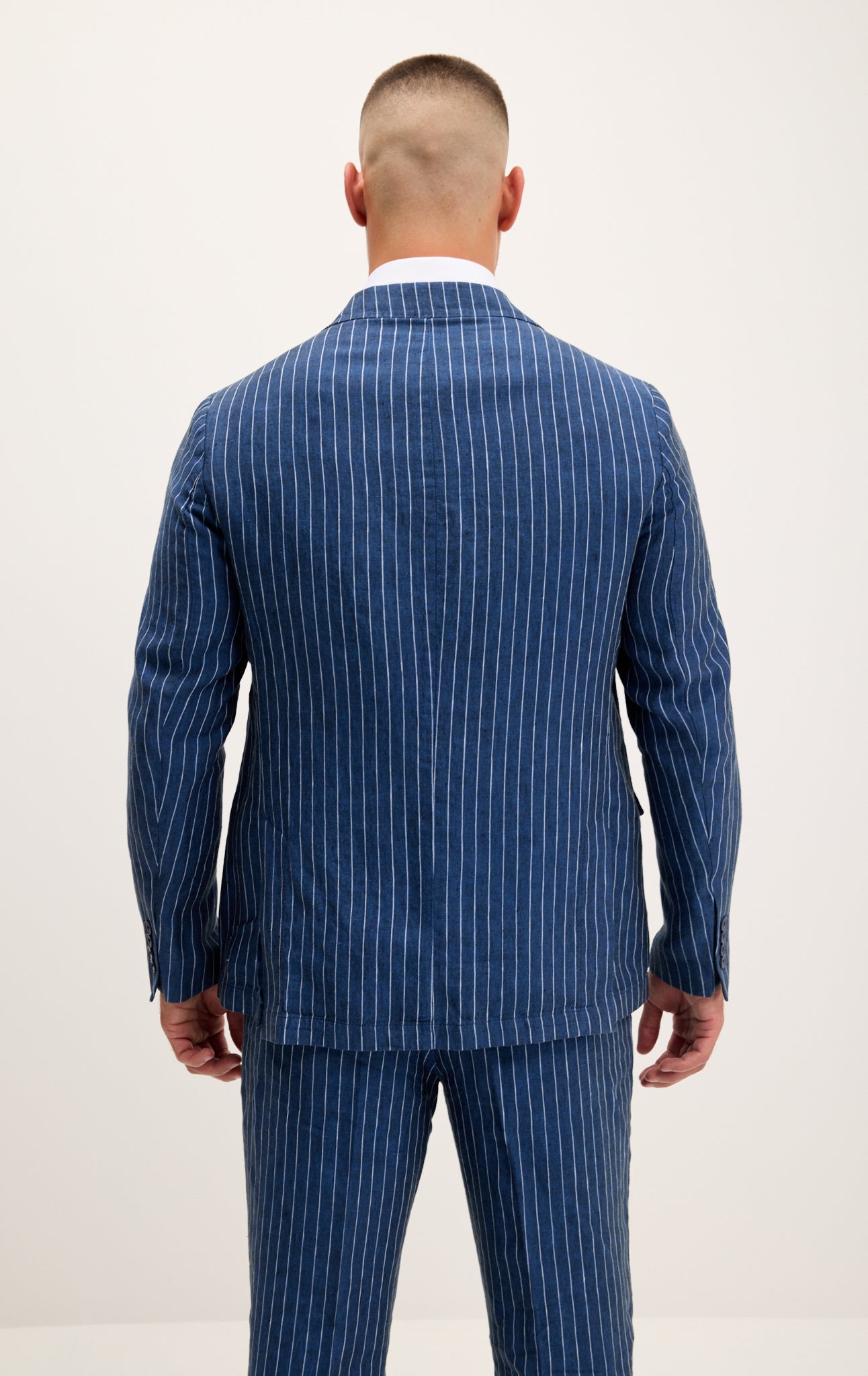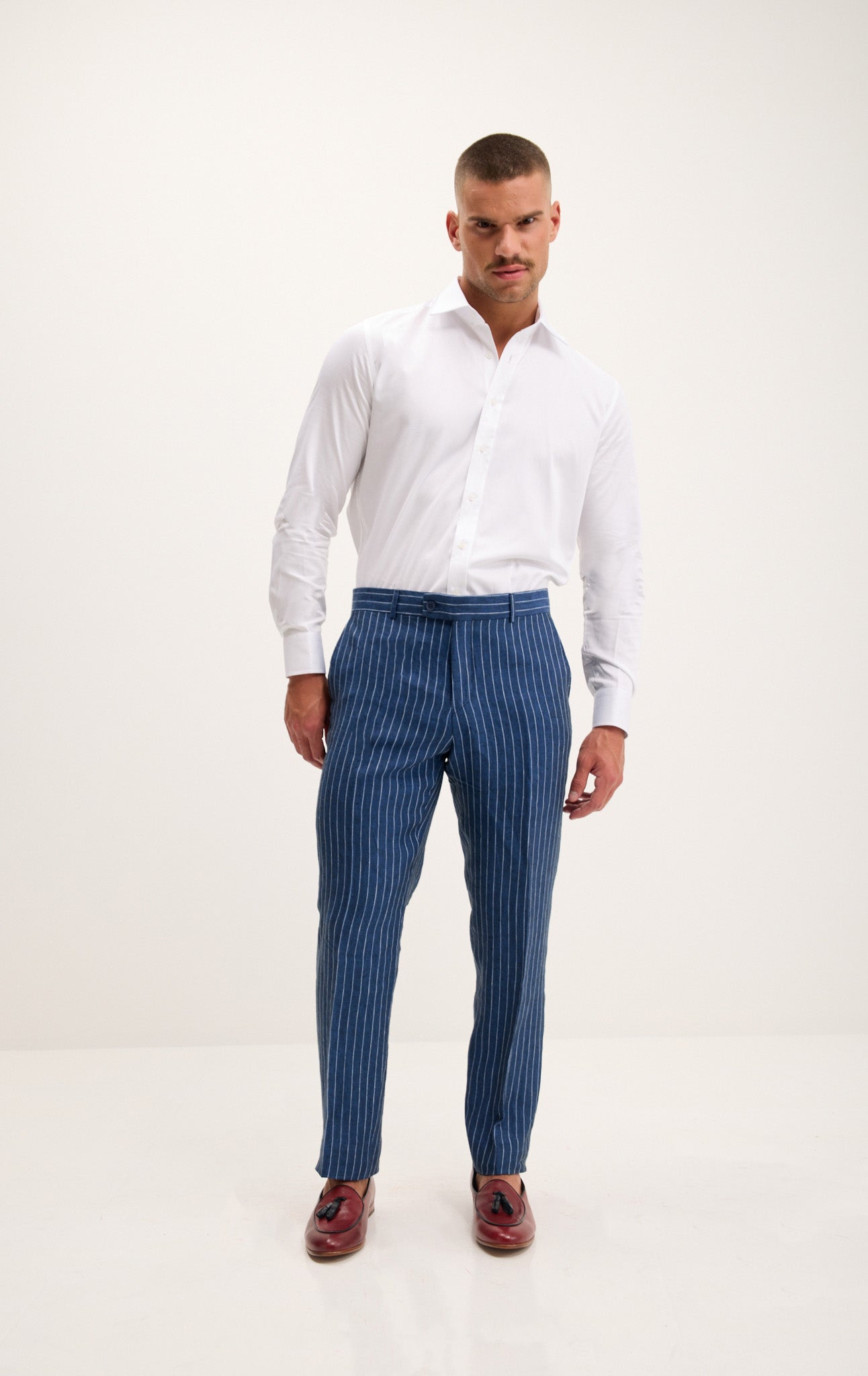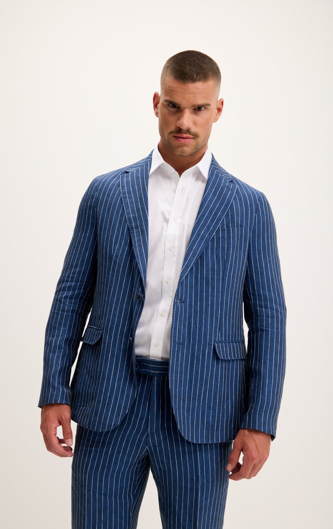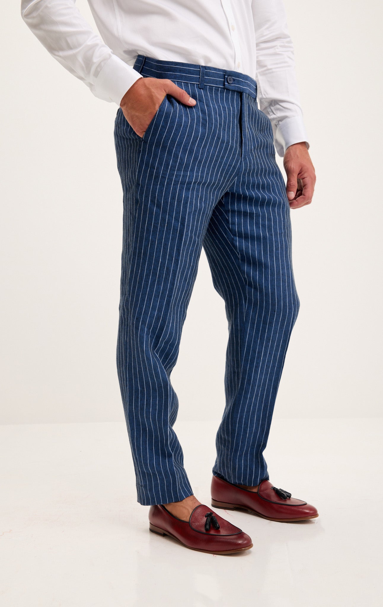Elevate your wardrobe with the Ron Tomson Pinstripe Pure Linen Single Breasted Suit, crafted from premium 100% linen for a lightweight, breathable fit. Featuring a classic pinstripe design in a sophisticated navy hue, this single-breasted suit offers a tailored silhouette with a notched lapel and single-button closure. Perfect for both formal occasions and stylish everyday wear, it includes matching trousers with a clean, modern cut. Ideal for warm weather, this suit combines timeless elegance with natural comfort.